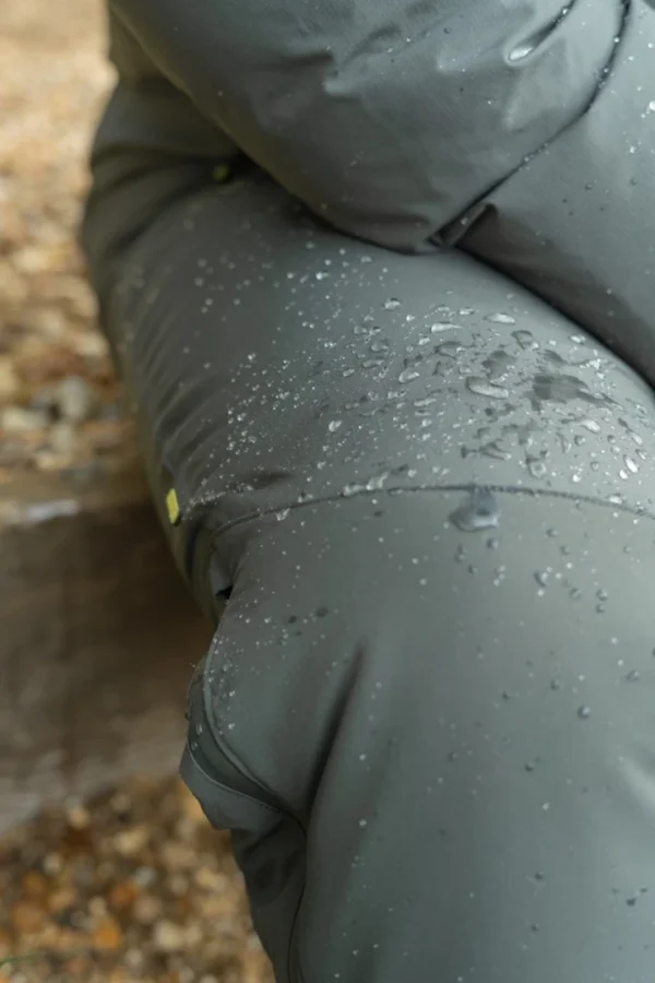 Zewnętrzna warstwa wykonana z mocnego poliestru ripstop została pokryta wodoodporną membraną. Wzmocnienia w newralgicznych miejscach – na kolanach, siedzeniu oraz wewnętrznych częściach nogawek – zwiększają trwałość i zabezpieczają tkaninę przed przetarciami. Na zewnętrznej stronie nogawek znajdują się wodoodporne zamki sięgające do kolan, które ułatwiają szybkie zakładanie i zdejmowanie spodni bez konieczności ściągania butów. Zamki osłonięto patkami przeciwwiatrowymi, aby lepiej chroniły przed chłodem.